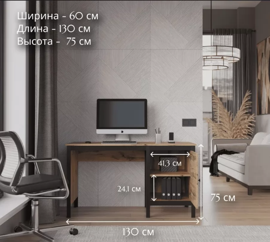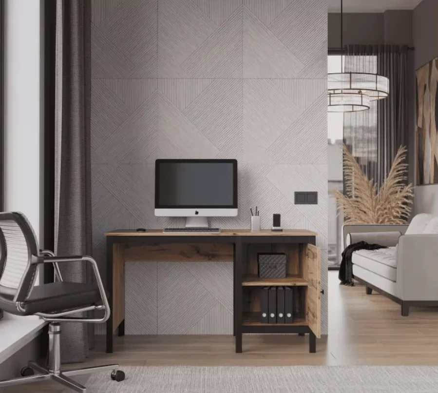 Стол выполнен в минималистичном стиле. Состоит из просторной столешницы и вместительной тумбочки справа. Вы с легкостью сможете разместить здесь компьютеры, ноутбуки и рабочие принадлежности.