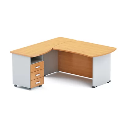 Используется ламинированная плита толщиной 28 мм и 22 мм стандарта эмиссии Е1. Торцы плиты облицованы прочной профилированной противоударной кромкой производства Германии. Цвет кромки соответствует цвету ДСП. Применяется фурнитура ведущих европейских производителей, в том числе центральные замки для тумб, роликовые направляющие выдвижных ящиков и регулируемые по высоте опоры столов и шкафов.