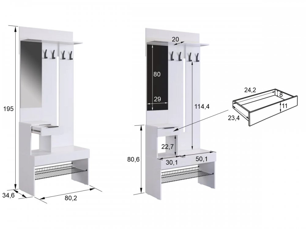 Крючки для одежды обеспечивают удобное место для размещения верхней одежды и аксессуаров, а выкатной ящик предоставляет дополнительное пространство для хранения мелочей. Сетчатая полка для обуви позволяет аккуратно разместить обувь, обеспечивая вентиляцию и легкий доступ.