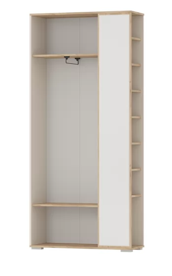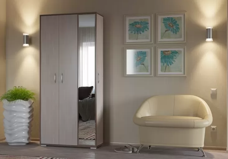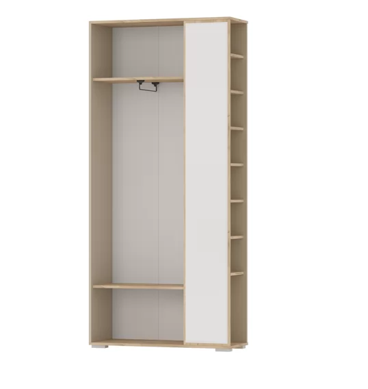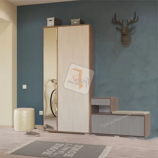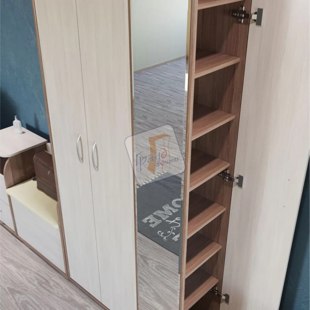 "Домино mini" - компактная прихожая с удобным местом для хранения обуви. В шкафу за распашными дверями внутри расположена штанга для одежды, в боковой нише за дверкой вместительные полки для обуви. Прихожая оснащена большим зеркалом.