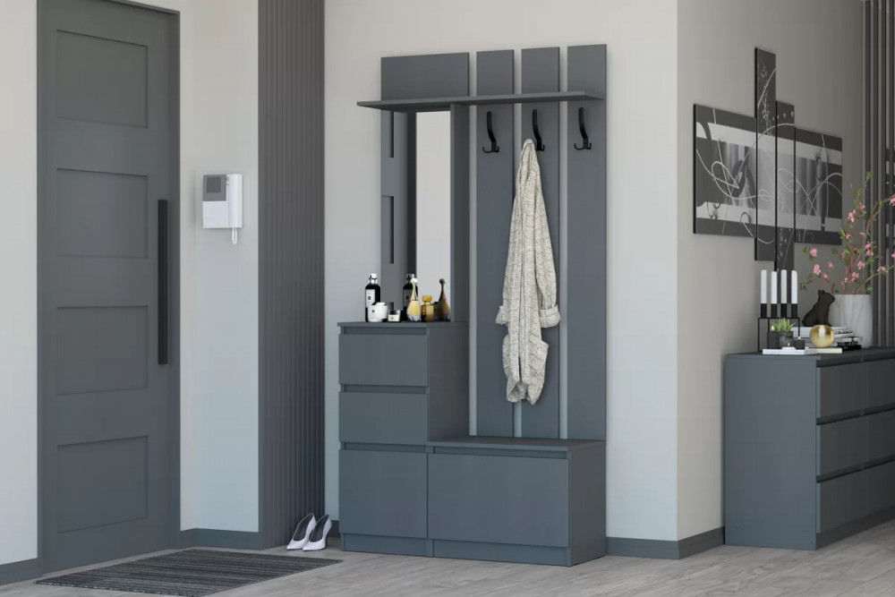 У данной прихожей 2 выдвижных ящика, 1 распашная и 1 откидная створка, отдел с крючками для верхней одежды.