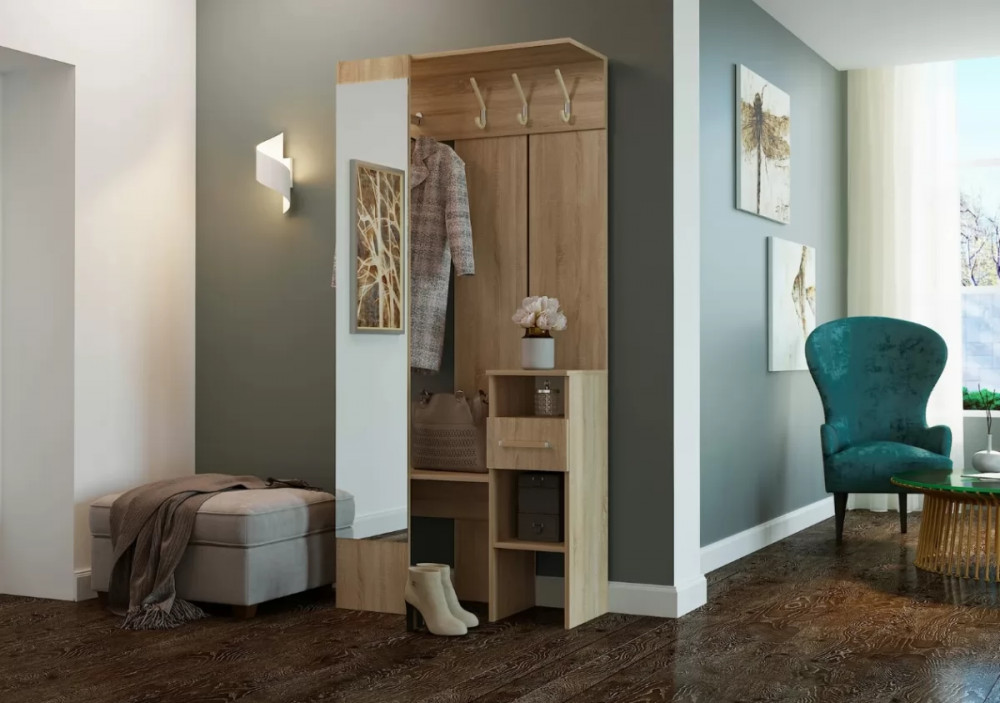 Удобная небольшая прихожая светлых оттенков. Красивая и функциональная, делает пространство более открытым за счет отсутствия сбоку стенки.