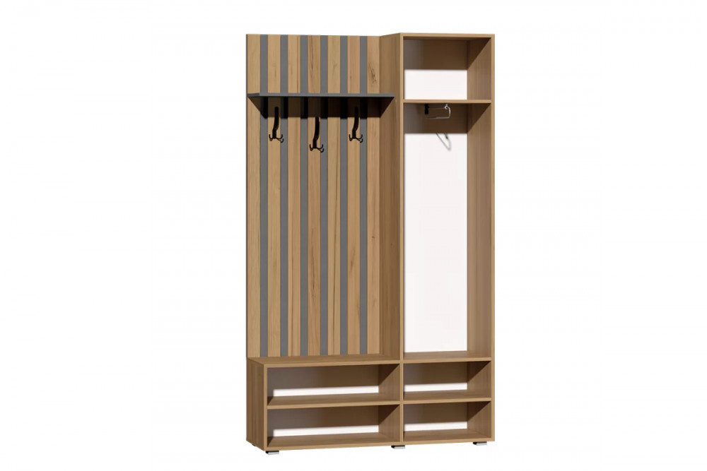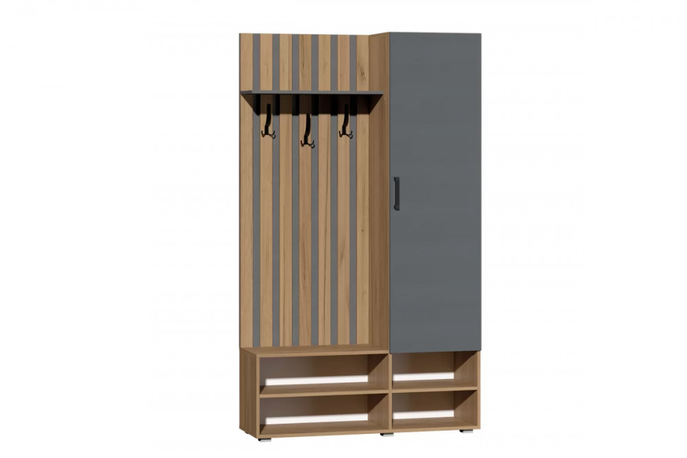 Очень функциональная прихожая, выполненная в современном сочетании теплой древесной текстуры с глубоким серым цветом - дуб крафт золотой с графитом.