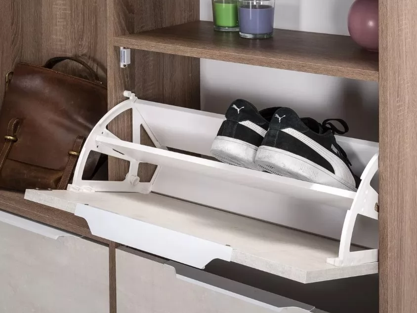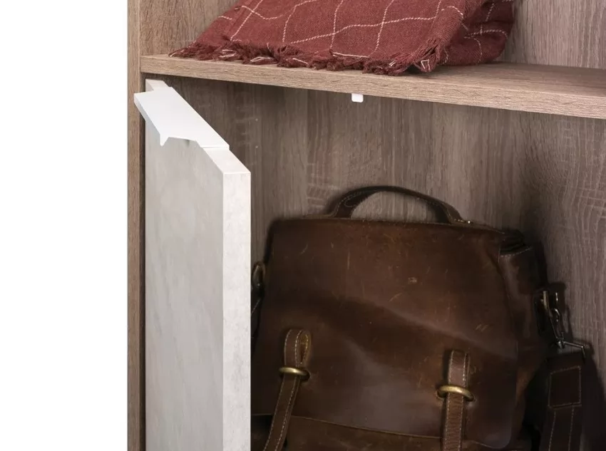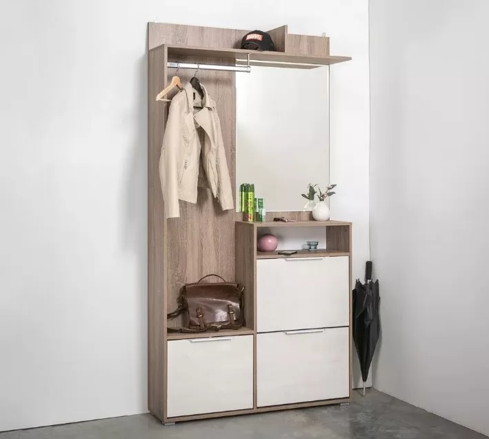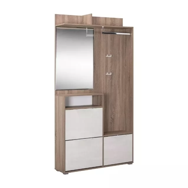 Прихожая "Темпо" - это улучшенная фукциональность в компактных габаритах. Глубина модуля всего 28 см, поэтому он отлично впишется в узкие помещения. При этом модуль содержит все необходимые в прихожей элементы: секции для обуви, полки, вешалки, крючки, зеркало. В дизайне используется сочетание насыщенной древесной текстуры и декора "шелковый камень", оригинальные ручки из металла с белым глянцевым покрытием.