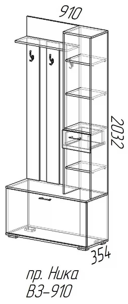 Вешалка с зеркалом В3910 "НИКА" – утончённое дополнение вашей прихожей. Этот товар изготовлен из материала ЛДСП, имеет следующие габариты: высота – 2032 мм, глубина – 354 мм, ширина – 910 мм. Эта прихожая имеет всё, что вам понадобится для эффективного хранения вещей: три крючка для одежды, сумок или зонтов, несколько открытых полок, ящики для аксессуаров и обуви. Боковая дверца оснащена небольшим зеркалом, что даёт вам ещё больше удобства от использования товара.