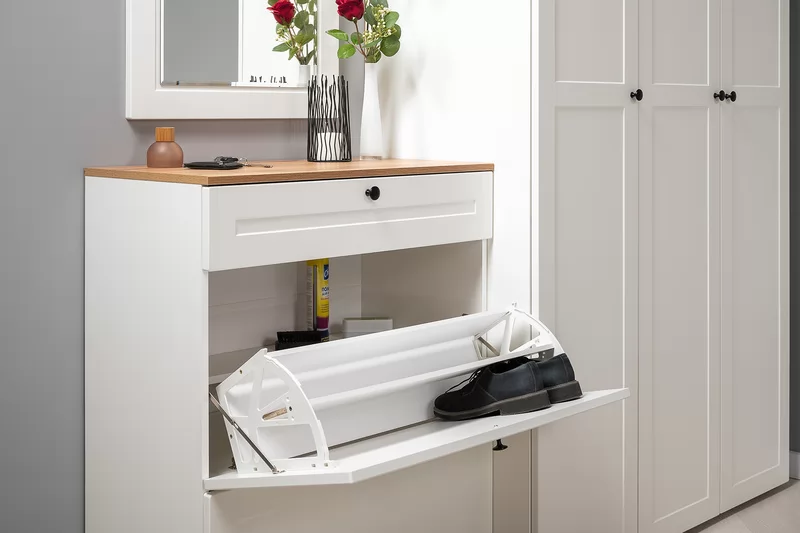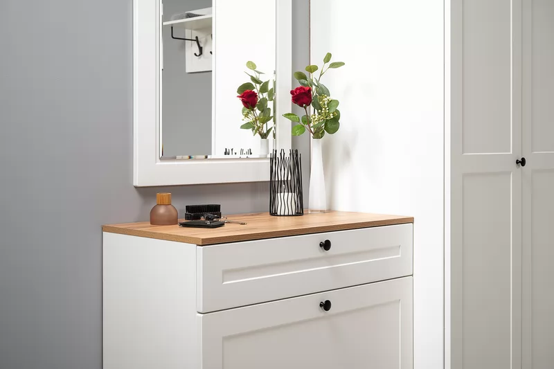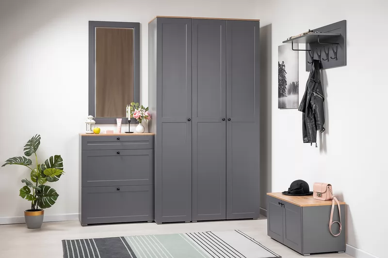 Прихожая доступна в двух цветовых решениях – белый/графит в сочетании с теплым древесным декором.