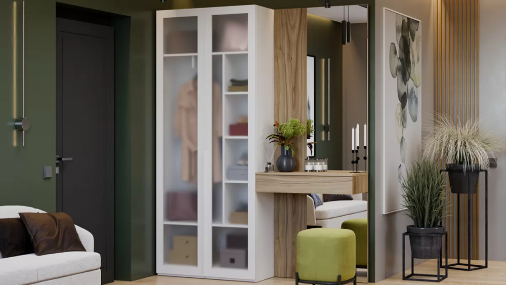 Прихожая «Порто» № 6 Яблоня Беллуно/Белый жемчуг/Стекло сатин белое