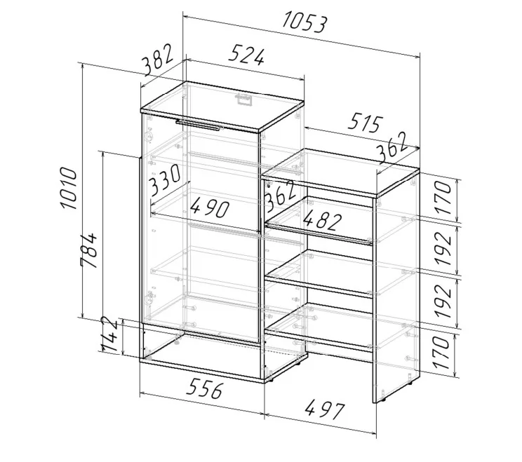 Габаритные размеры всего изделия – Д.1053 х В.1010 х Г.385мм (с учётом опор).