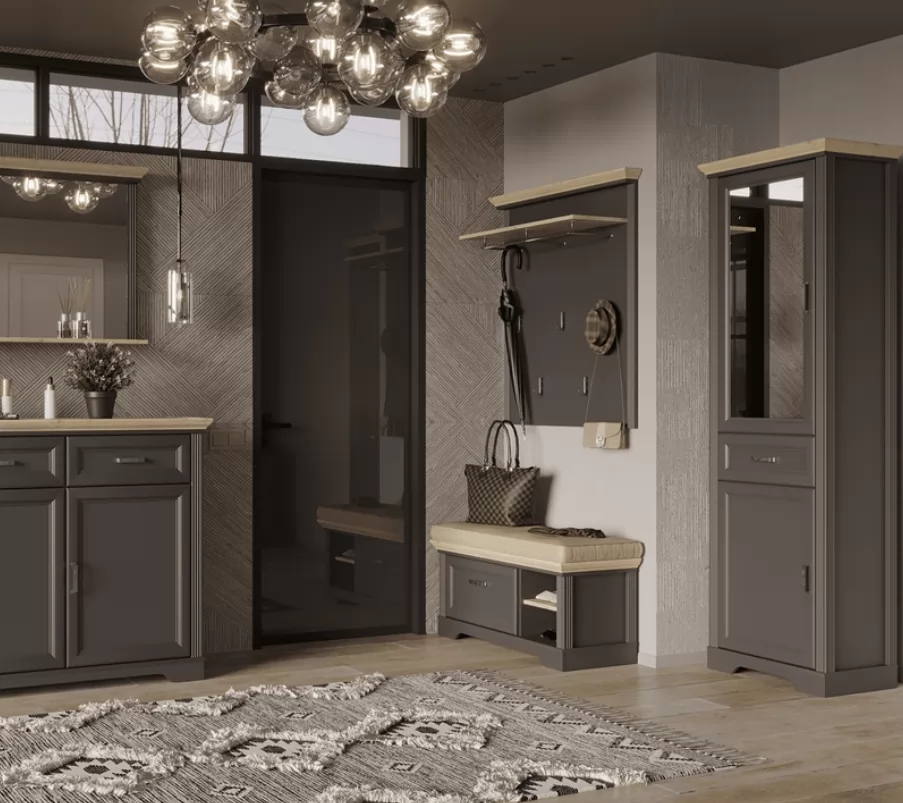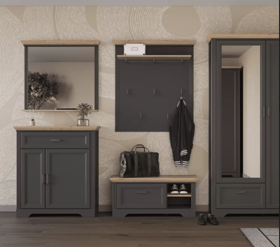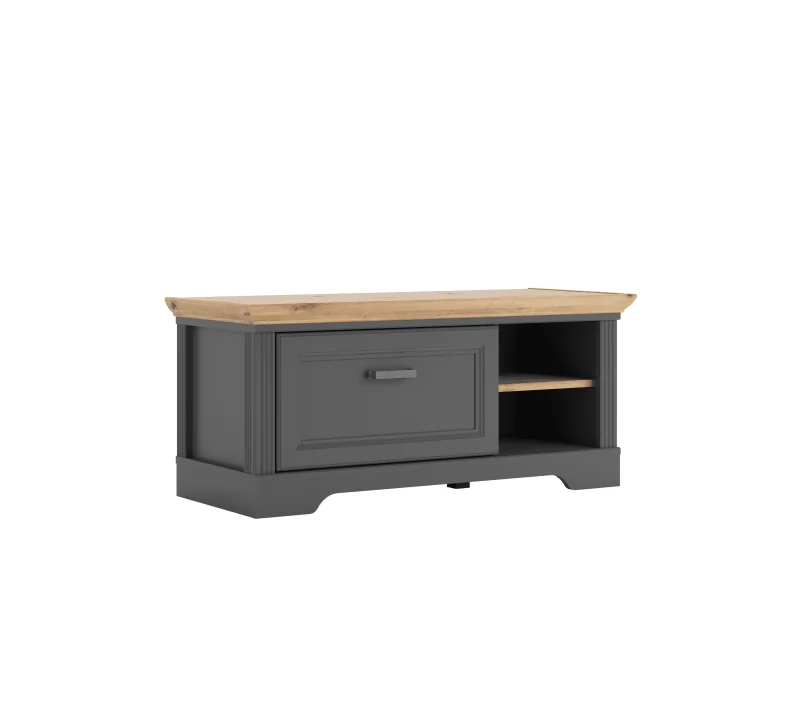 Тумба имеет открытые полки для хранения обуви и аксессуаров. Вместительный выдвижной ящик оснащен механизмом плавного закрытия. Акцентная столешница предоставляет место для хранения сумок, ключей и элементов декора. Металлическая ручка не скользит в руке и удобна в использовании.