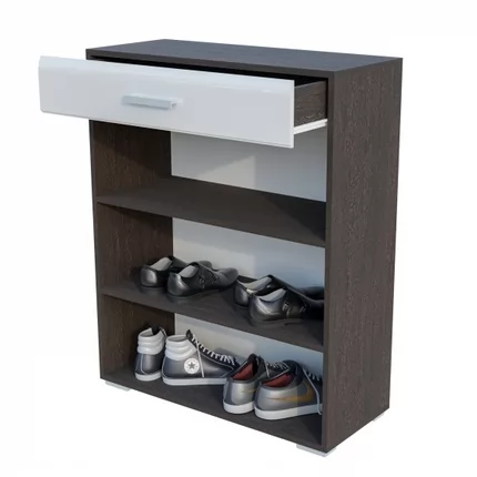 Комод оснащён тремя закрытыми полками за двумя створками и одним вместительным выдвижным ящиком.