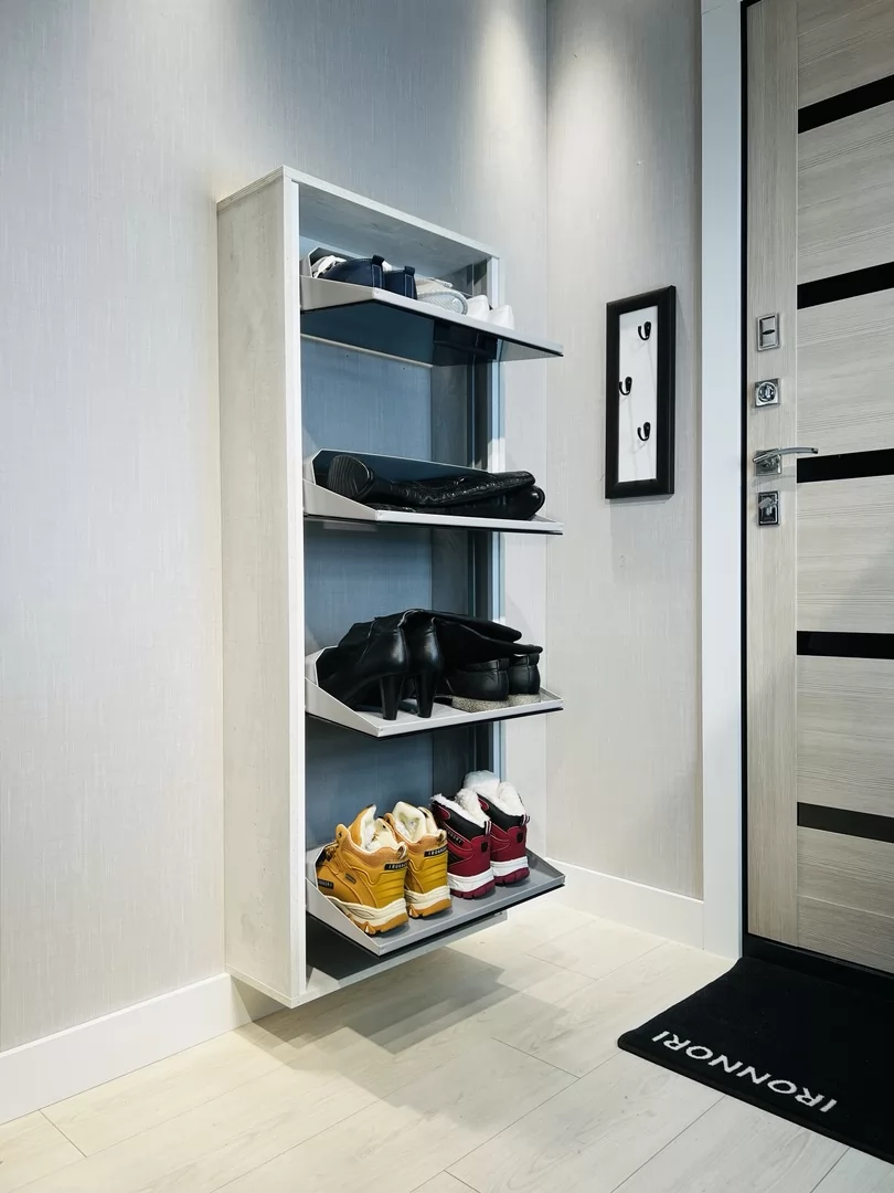 Обувница Лайт 4 секции — компактное решение для создания функционального интерьера в небольшой современной прихожей. Производимая нами фурнитура работает по принципу веера, обеспечивая синхронное открытие лотков, и позволит аккуратно хранить всю необходимую обувь.
