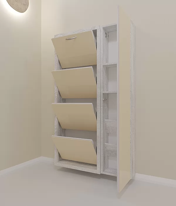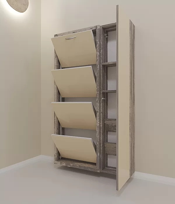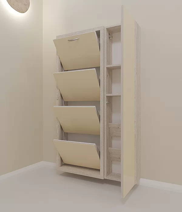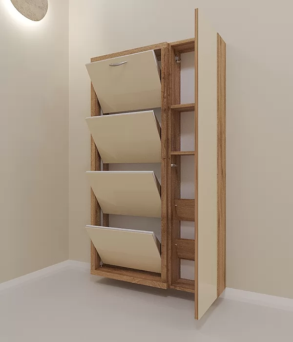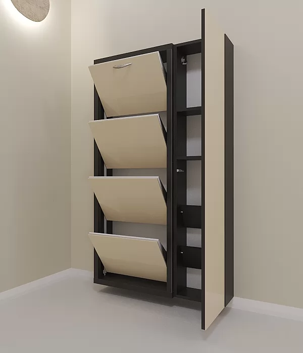 Обувница Люкс Дуэт 4 секции — компактное решение для создания функционального интерьера в небольшой современной прихожей. Производимая нами фурнитура работает по принципу веера, обеспечивая синхронное открытие лотков, и позволит аккуратно хранить всю необходимую обувь.