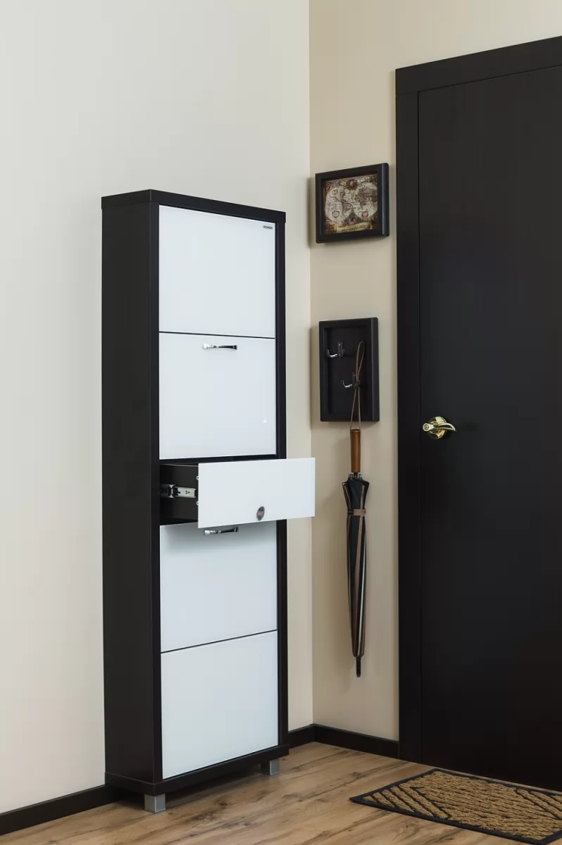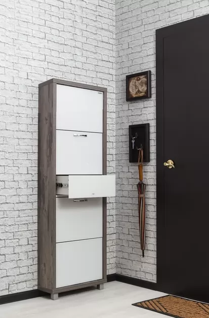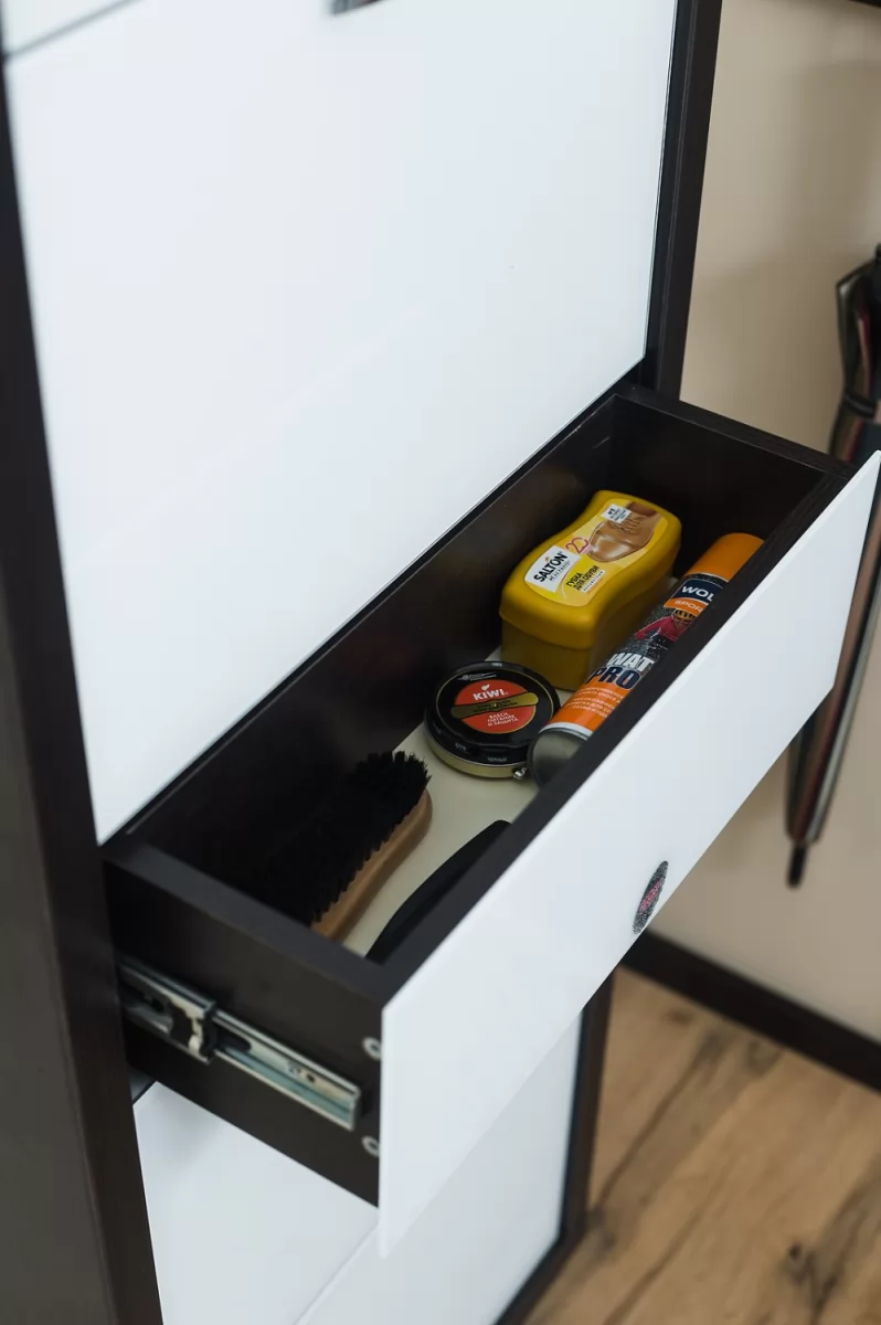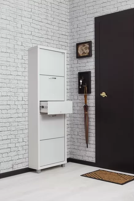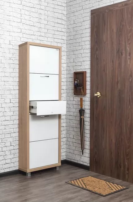 Обувной шкаф с дополнительным выдвижным ящиком для мелочей поможет организовать хранение всех необходимых вещей.