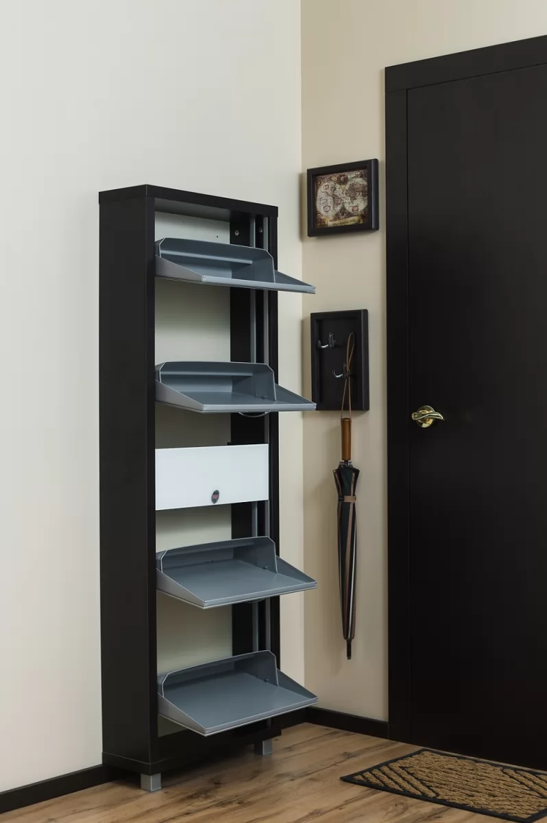 Производимая нами фурнитура работает по принципу веера, обеспечивая синхронное открытие лотков, и позволит аккуратно хранить всю необходимую обувь.
