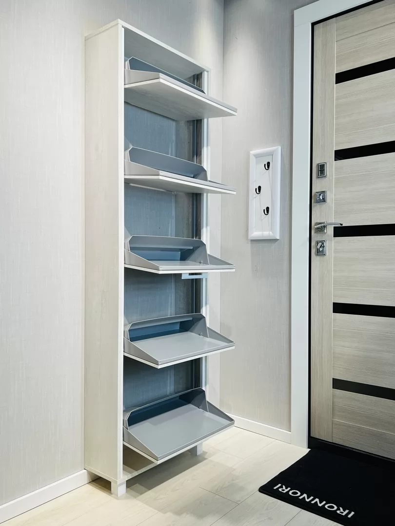 Обувница Лайт 5 секций — компактное решение для создания функционального интерьера в небольшой современной прихожей. Производимая нами фурнитура работает по принципу веера, обеспечивая синхронное открытие лотков, и позволит аккуратно хранить всю необходимую обувь.