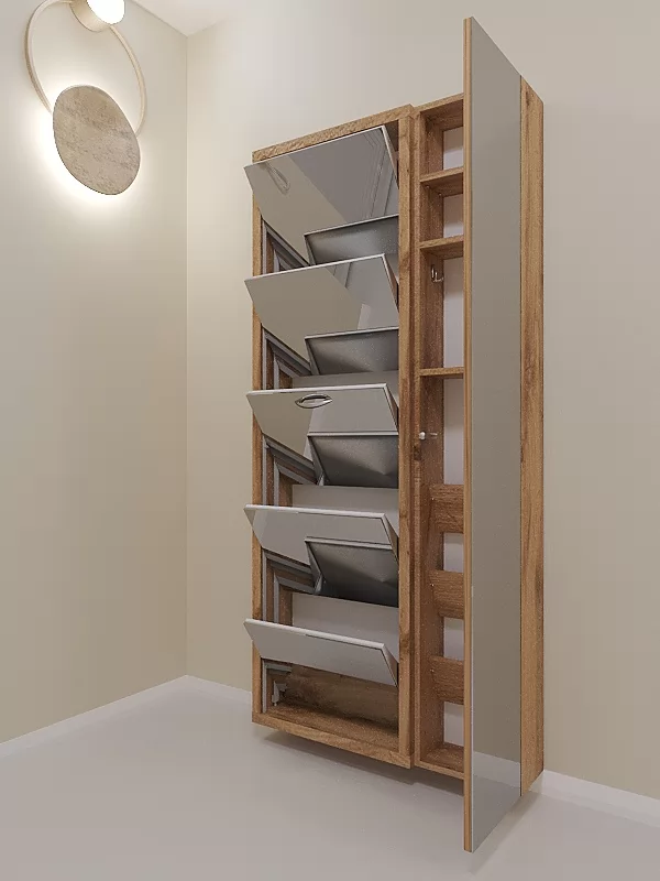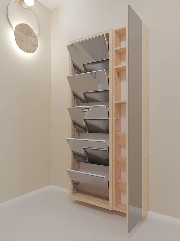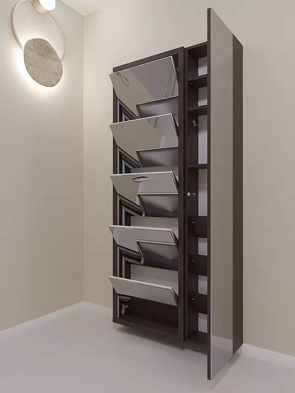 Обувница Люкс Дуэт 5 секции — компактное решение для создания функционального интерьера в небольшой современной прихожей. Производимая нами фурнитура работает по принципу веера, обеспечивая синхронное открытие лотков, и позволит аккуратно хранить всю необходимую обувь.