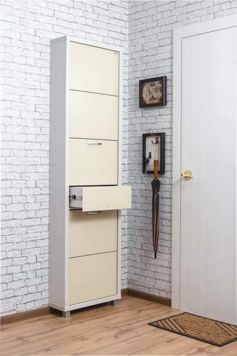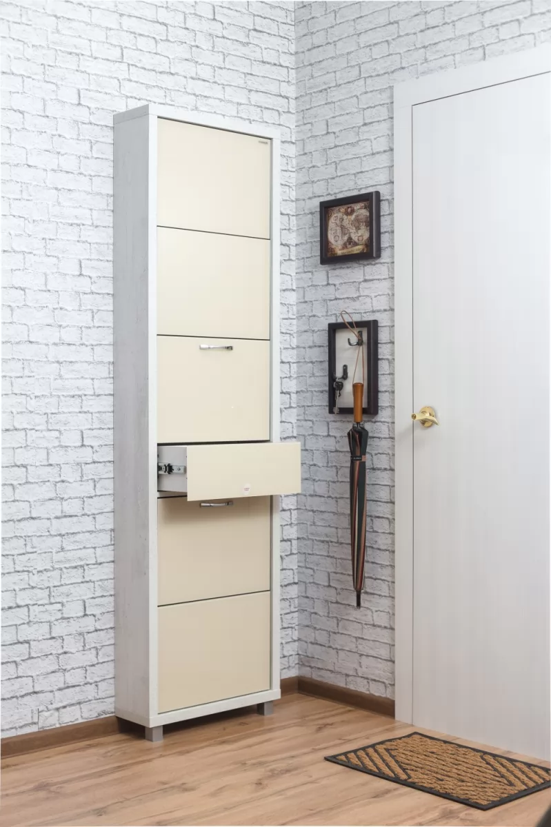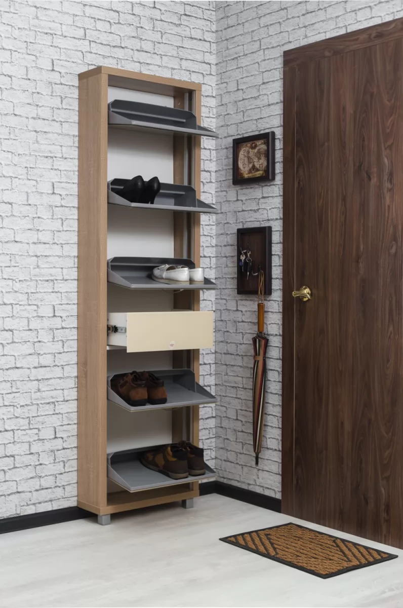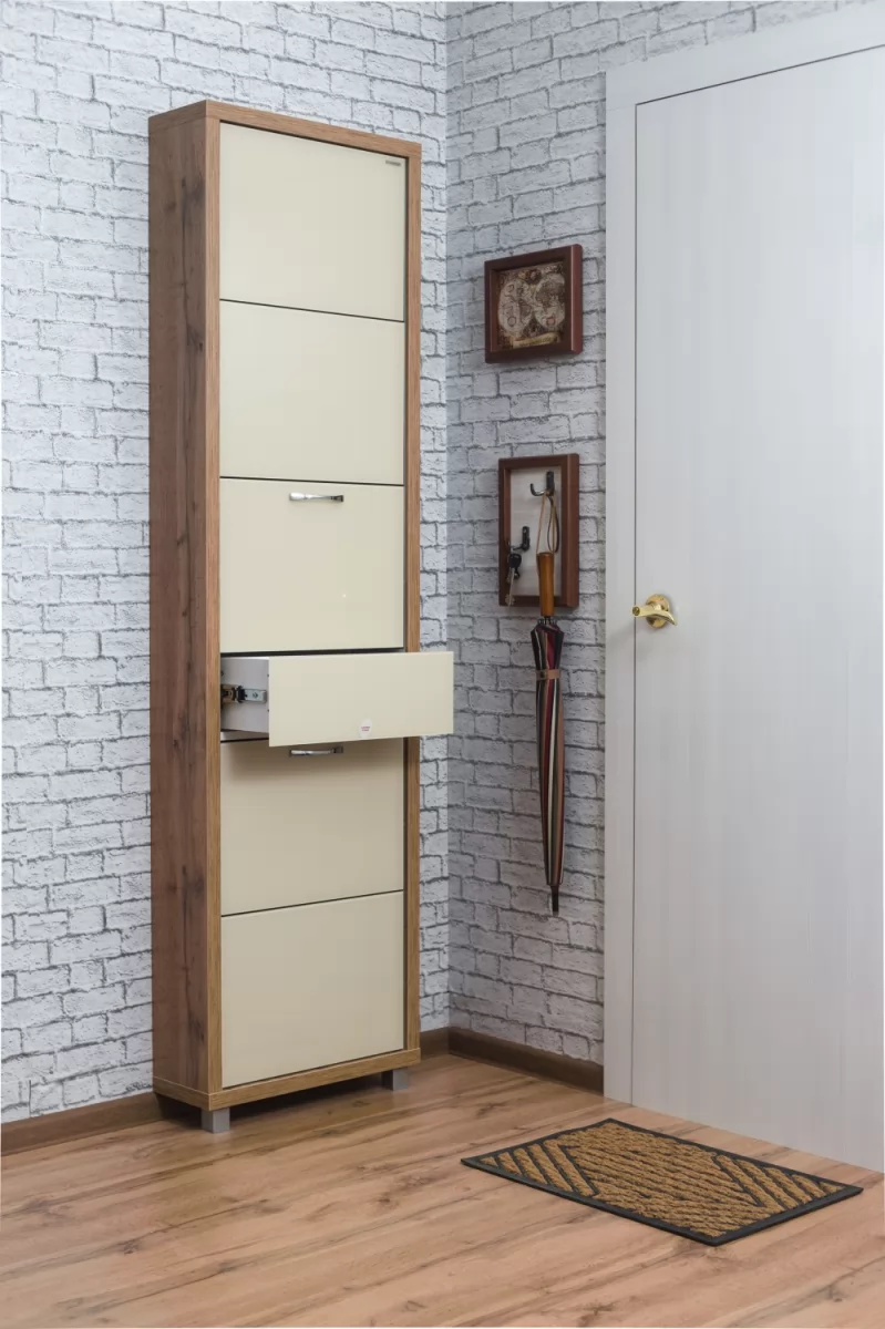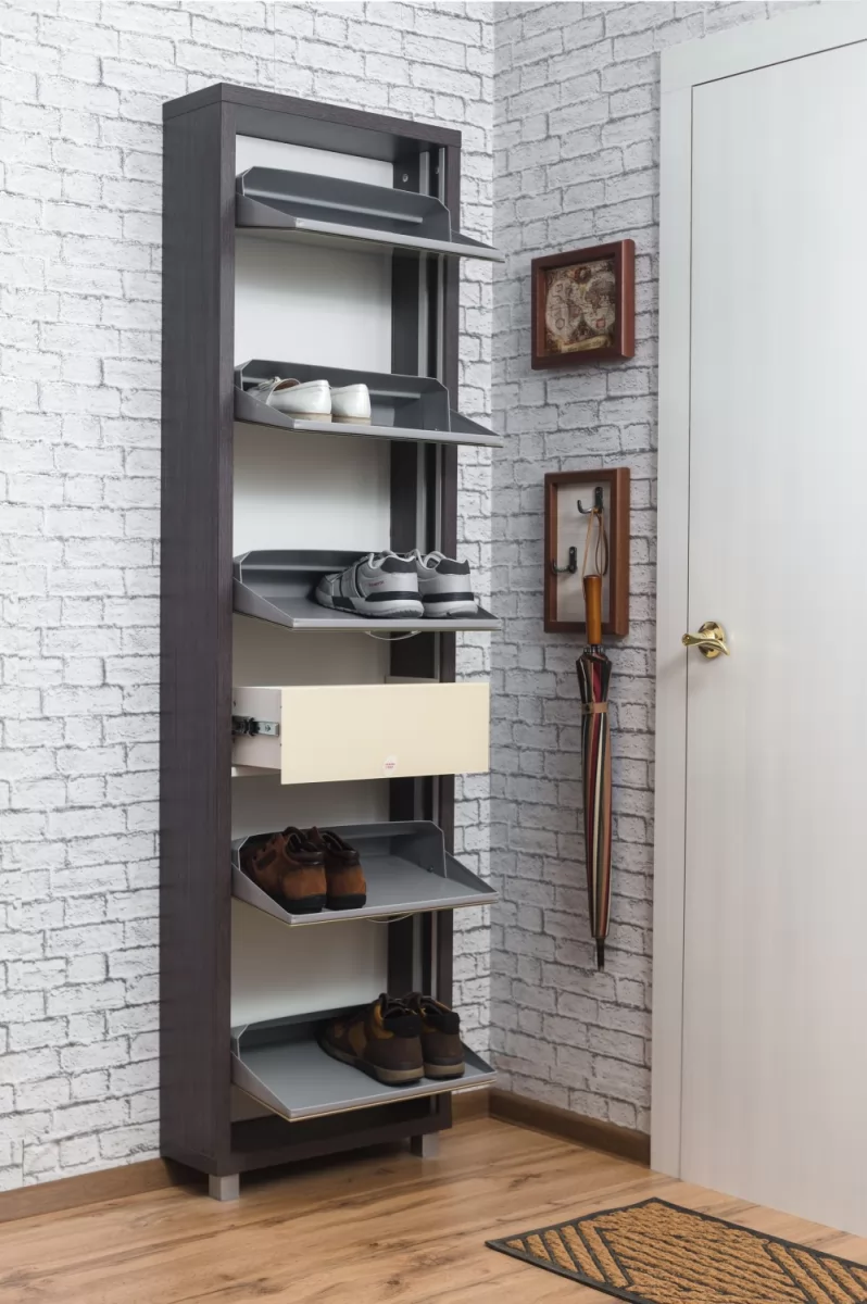 Обувной шкаф с дополнительным выдвижным ящиком для мелочей поможет организовать хранение всех необходимых вещей.