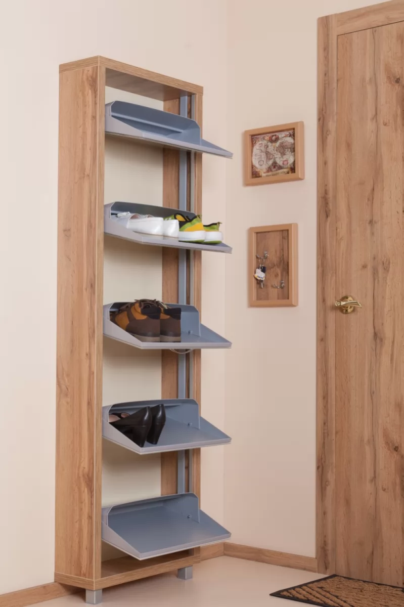 Производимая нами фурнитура работает по принципу веера, обеспечивая синхронное открытие лотков, и позволит аккуратно хранить всю необходимую обувь.