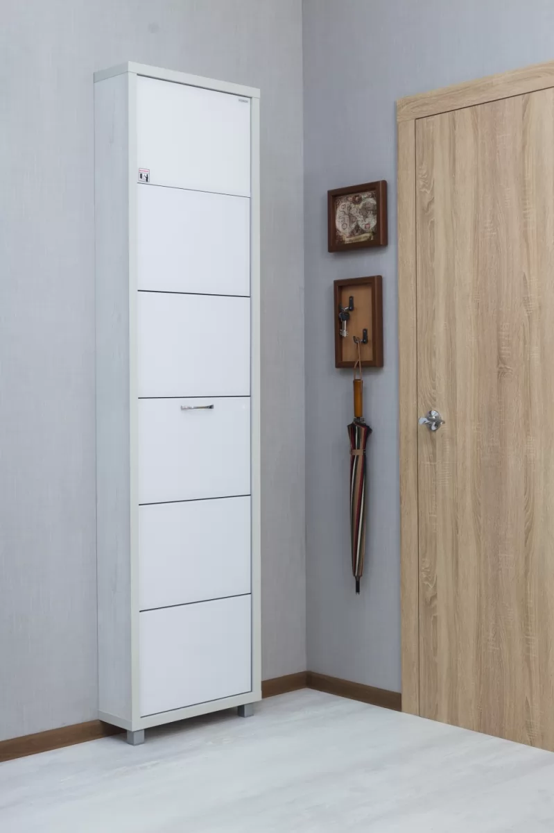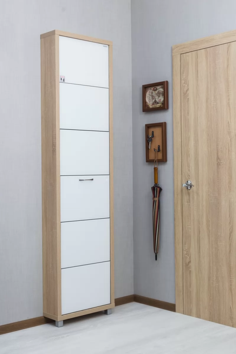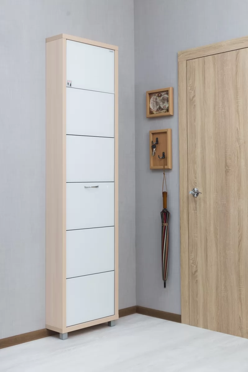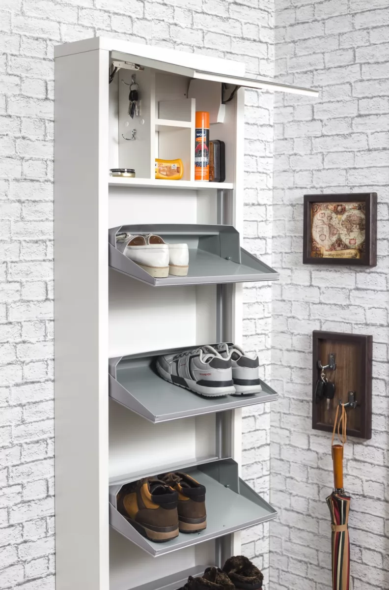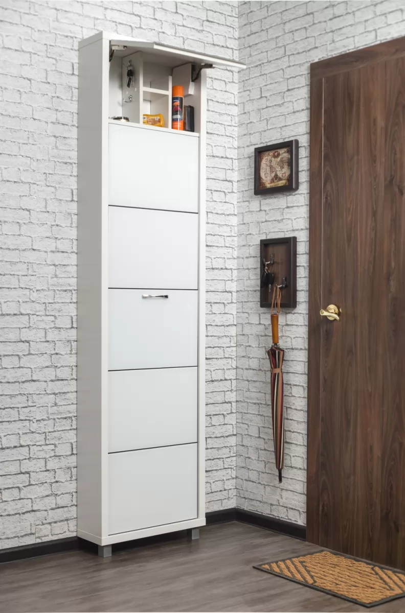 Обувной шкаф с дополнительным большим откидным ящиком для мелочей поможет организовать хранение всех необходимых вещей.
