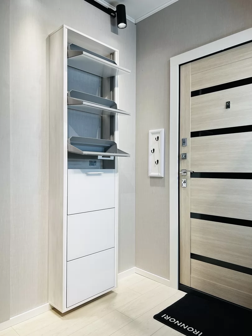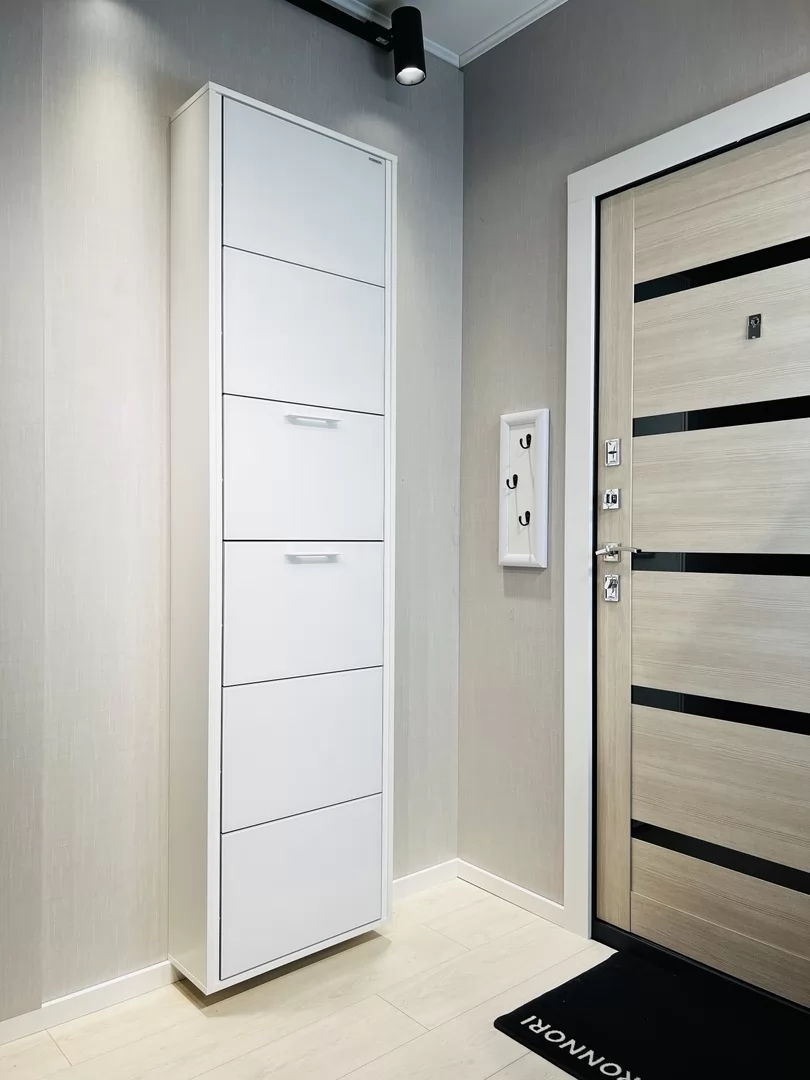Обувница Лайт 6 секции — компактное решение для создания функционального интерьера в небольшой современной прихожей. Производимая нами фурнитура работает по принципу веера, обеспечивая синхронное открытие лотков, и позволит аккуратно хранить всю необходимую обувь.