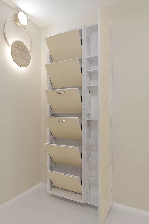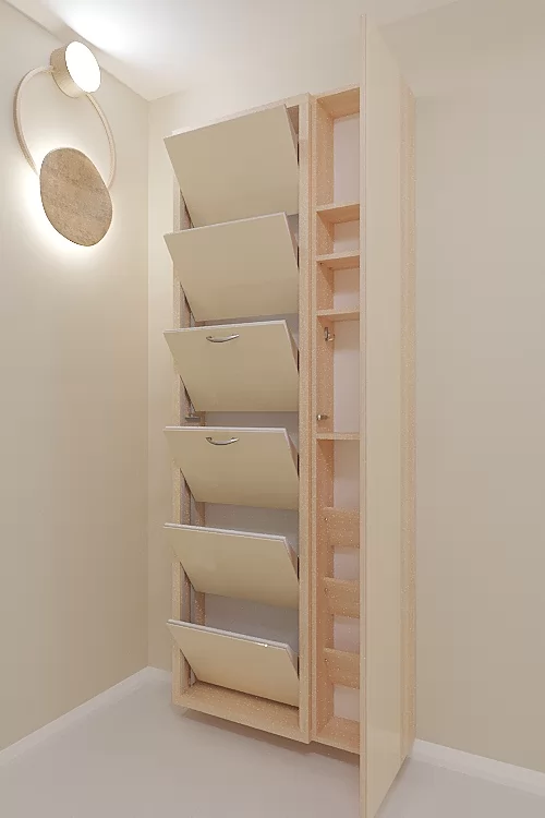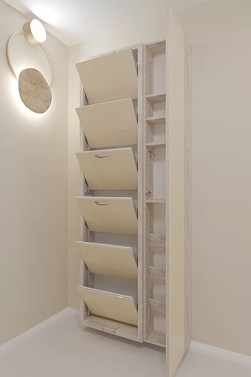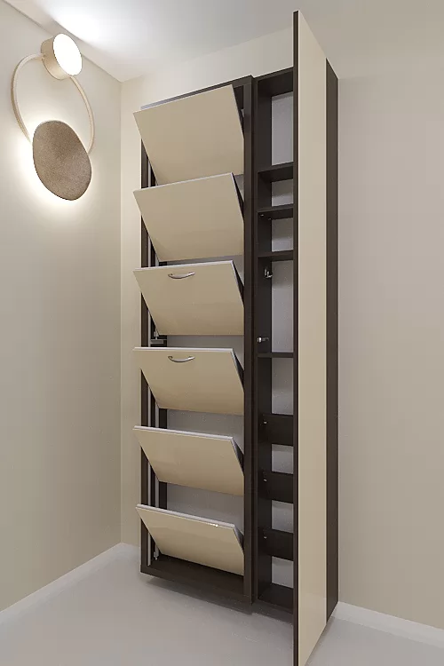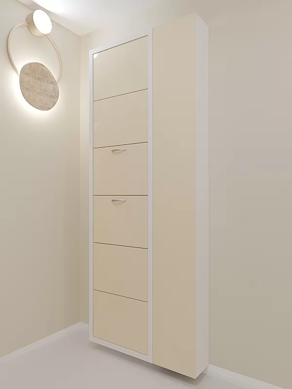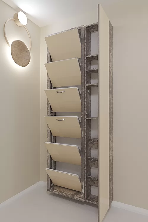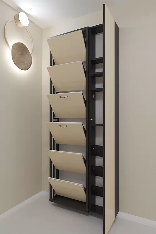 Обувница Люкс Дуэт 6 секции — компактное решение для создания функционального интерьера в небольшой современной прихожей. Производимая нами фурнитура работает по принципу веера, обеспечивая синхронное открытие лотков, и позволит аккуратно хранить всю необходимую обувь.