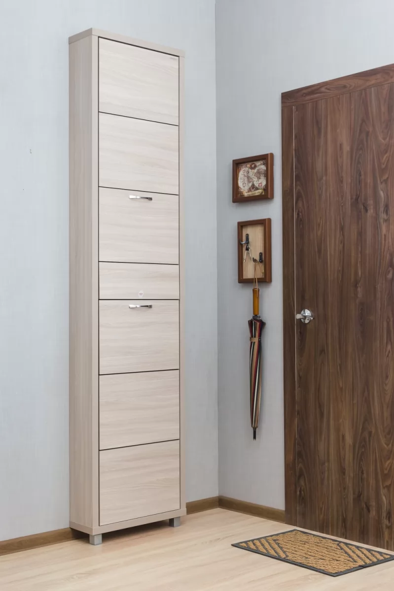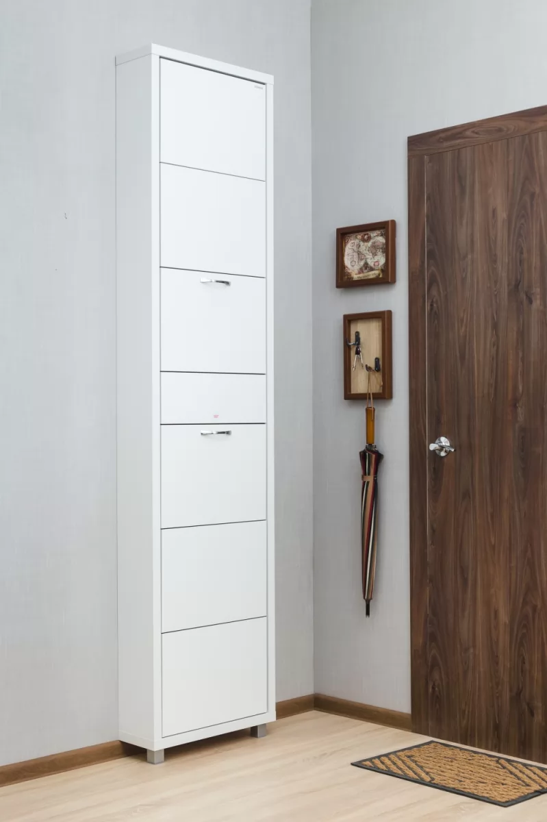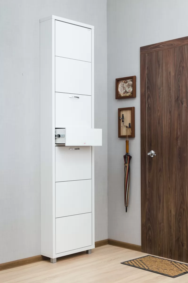 Обувной шкаф с дополнительным выдвижным ящиком для мелочей поможет организовать хранение всех необходимых вещей.