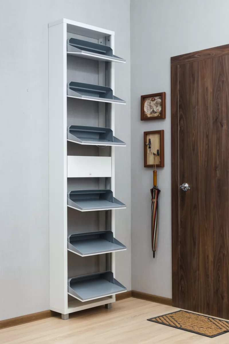 Производимая нами фурнитура работает по принципу веера, обеспечивая синхронное открытие лотков, и позволит аккуратно хранить всю необходимую обувь.