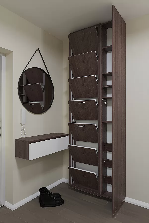 Обувница Люкс Дуэт 7 секции — компактное решение для создания функционального интерьера в небольшой современной прихожей. Производимая нами фурнитура работает по принципу веера, обеспечивая синхронное открытие лотков, и позволит аккуратно хранить всю необходимую обувь.