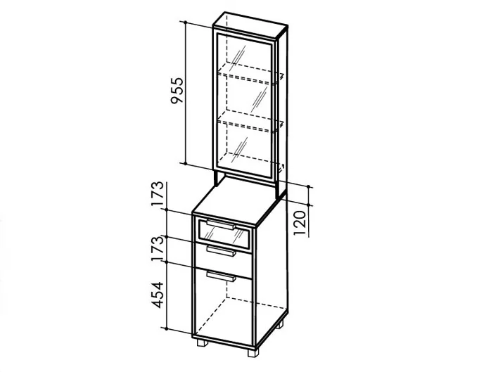 2. За верхним фасадом 3 полки - одна жесткая (нижняя), две съемные.