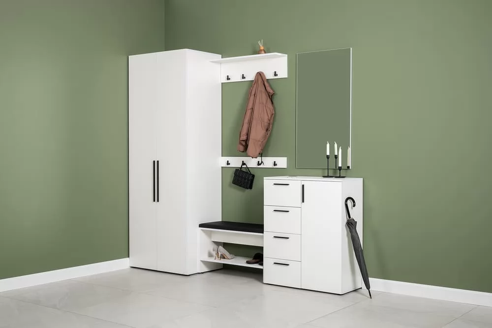 Нейтральный белый цвет визуально расширит ограниченное пространство прихожей.