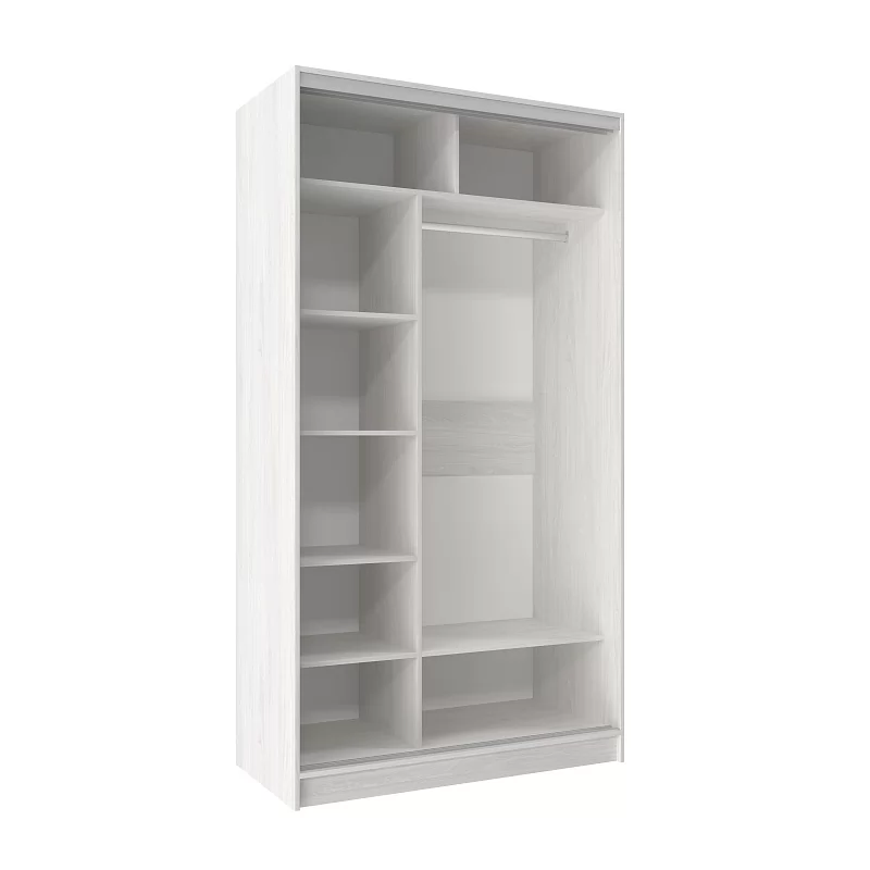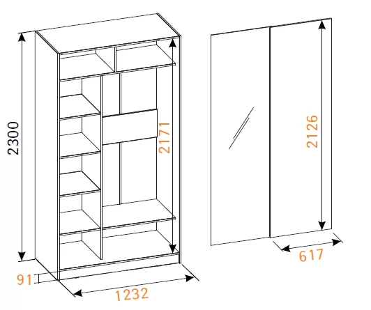 Продуманное внутреннее наполнение шкафа состоит из стеллажа для белья и стационарной штанги длиной 725 мм. На ней поместится как минимум 10 плечиков с верхней одеждой. В шкафу-купе используется стальная система "Найди". Применяемый в ее изготовлении металл обеспечивает мебели необходимую прочность и долговечность. По краю дверей шкафа-купе защитная пленка препятствует повреждению красочного слоя металлического профиля. После установки шкафа ее можно удалить.В комплектацию входит шлегель - щётки с толстым ворсом, которые устанавливаются на профиль дверей шкафа-купе и приглушают удары дверей при закрывании, а также способствуют пыленепроницаемости. На скрытых полкодержателях Titus полки шкафов-купе крепятся жестко. Возможна регулировка полок по высоте. Зеркальная дверца с обратной стороны проклеена специальной защитной пленкой, которая предотвратит от падения осколков, если она разобьется.