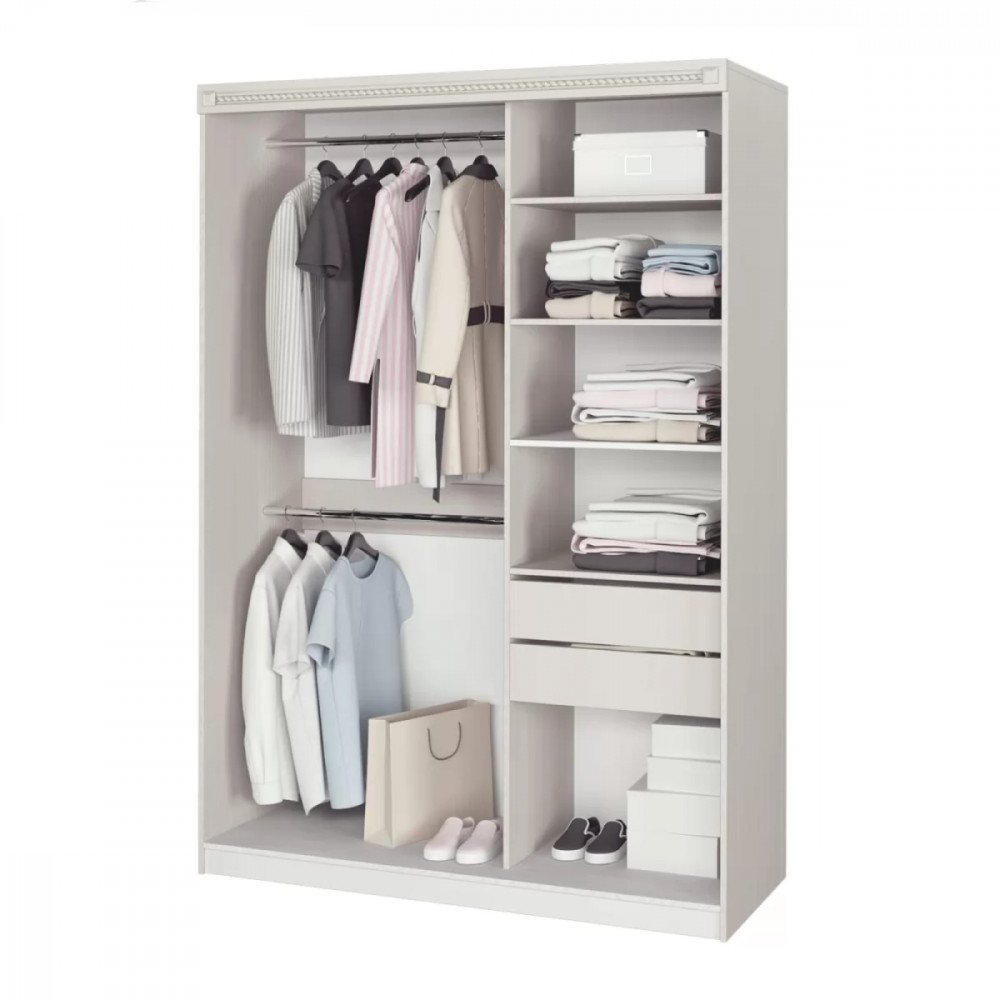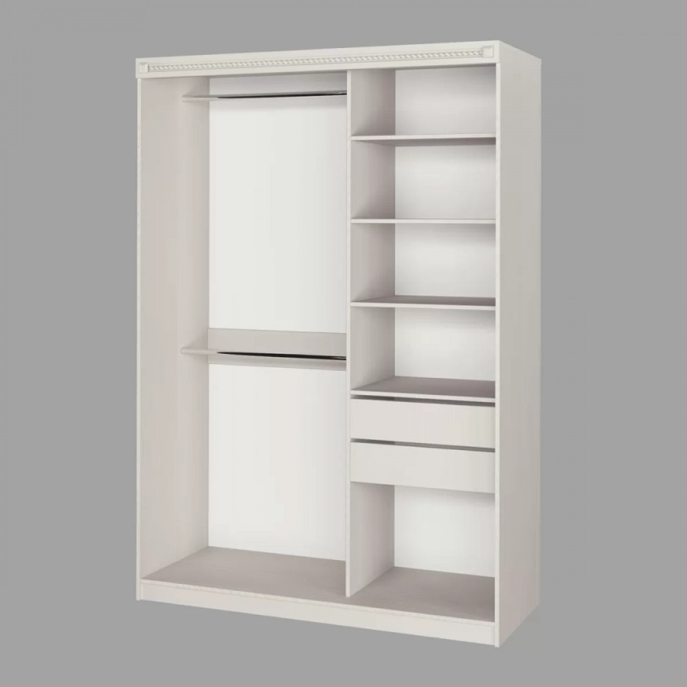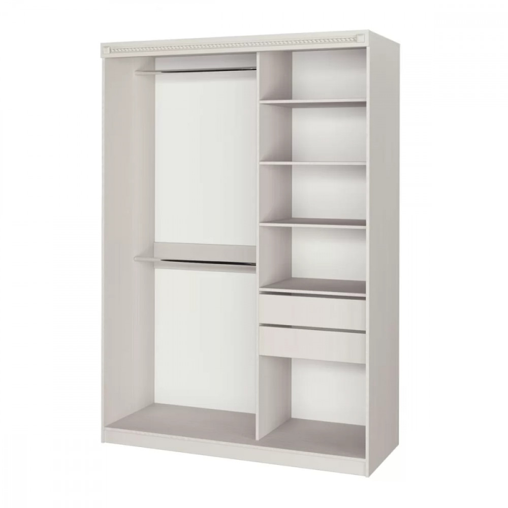 Шкаф-купе №26 "Азалия" разделен на две секции. Одна из секций предназначена для размещения одежды на вешалках и комплектуется двумя штангами. Вторая секция имеет полки и два выдвижных ящика для белья. Шкаф декорирован планкой МДФ с фрезеровкой.