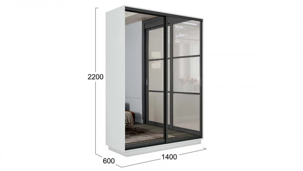 Шкаф-купе 2-х дверный «Румер-2» Белый снег, Зеркало, Черный профиль