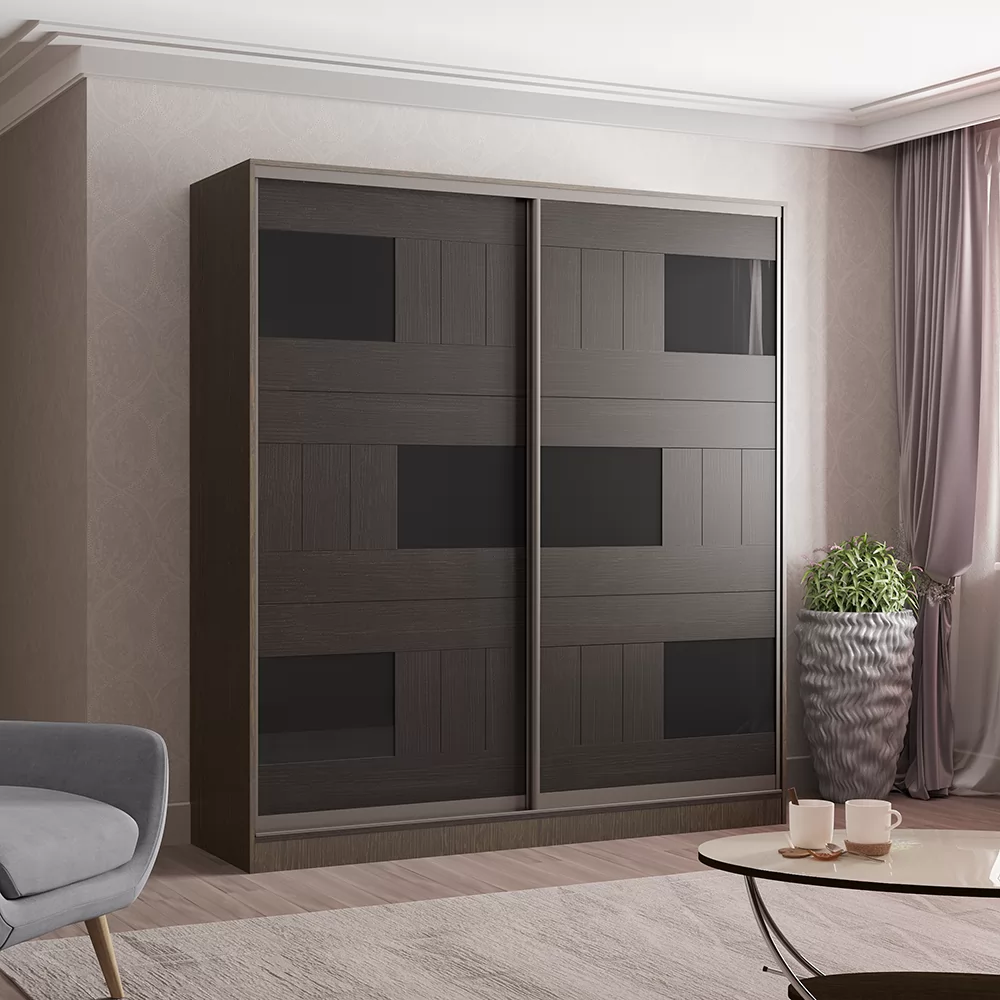 Большой и вместительный шкаф-купе Лотос 2 подойдет для меблировки спальни или гостиной в современном стиле. Отличительной особенностью шкафа являются его привлекательные фасады со стеклянными вставками, благодаря которым шкаф смотрится стильно и благородно.