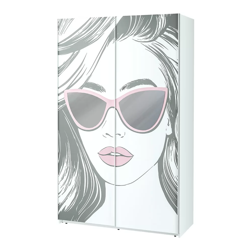 -стильная модель декорирована фотопечатью с изображением лица девушки в очках, стекла которых одновременно служат зеркалом.