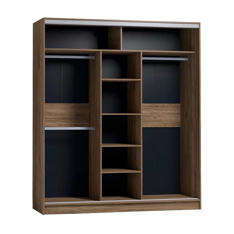 Шкаф-купе STRIKE шириной 1800 мм подойдет для любой комнаты: спальни, гостиной, прихожей, детской. Продуманное внутреннее наполнение шкафа состоит из полок для белья и трех стационарных штанг длиной 635 мм. Разная высота крепления штанг позволяет держать в порядке короткие пиджаки, брюки и длинные вещи отдельно друг от друга. В изготовлении шкафов-купе STRIKE использована прочная стальная система треков «Найди» цвета Металлик. Двери шкафов-купе STRIKE дополнены ручками из массива и шлегелем, который смягчает удары дверей при закрывании, а также защищают вещи от попадания пыли. Благодаря скрытым полкодержателям полки шкафов-купе STRIKE жестко крепятся на необходимой высоте.