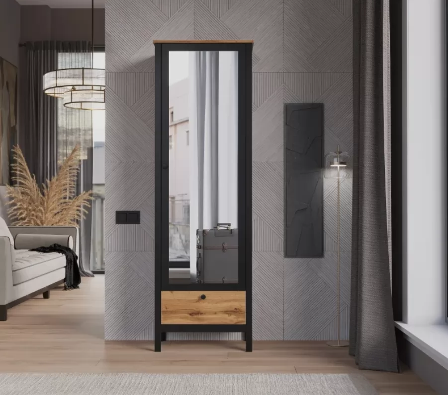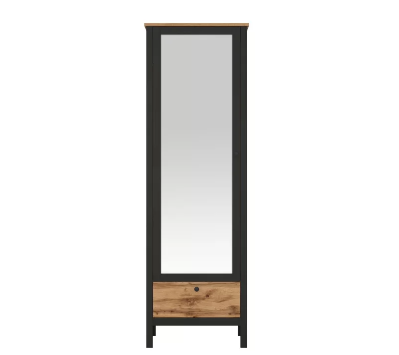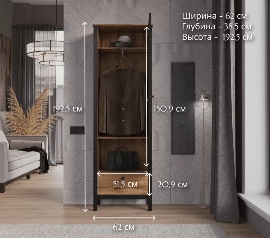 Стильный и функциональный шифоньер имеет вместительный отдел со штангой и тремя полками. Благодаря такой системе хранения вы сможете удобно разместить верхнюю одежду на вешалках, а головные уборы, сумочки и обувь — на полках. Выдвижной ящик на шариковых направляющих будет удобен для размещения необходимых мелочей.