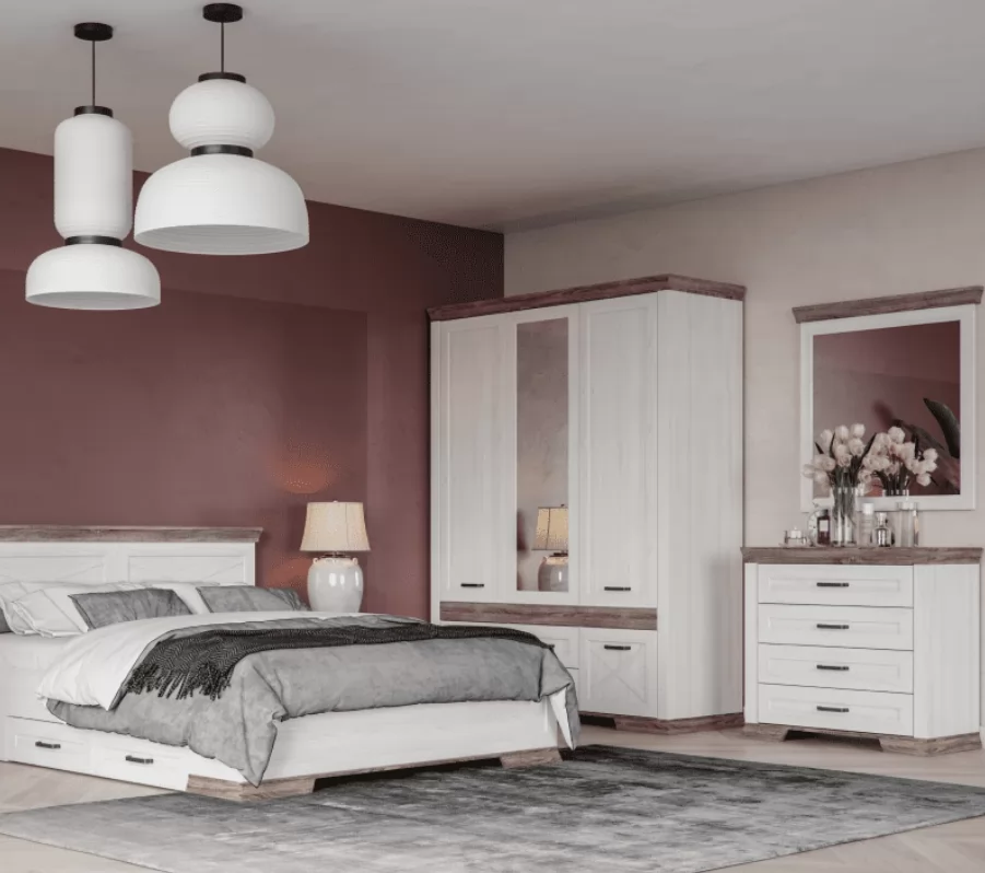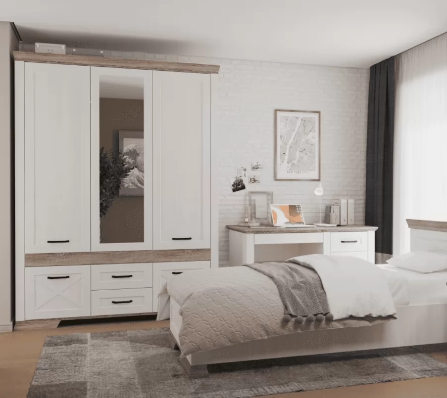 Вместительный и негабаритный элемент интерьера. Правая распашная дверка скрывает доступ к четырем нишам для хранения вещей в стопках, постельного белья или органайзеров для одежды. Две распашные двери слева предоставляют доступ к отделу со стационарной штангой для вертикального расположения верхней одежды. Встроенный комод отлично подойдет для размещения мелких элементов гардероба и аксессуаров.