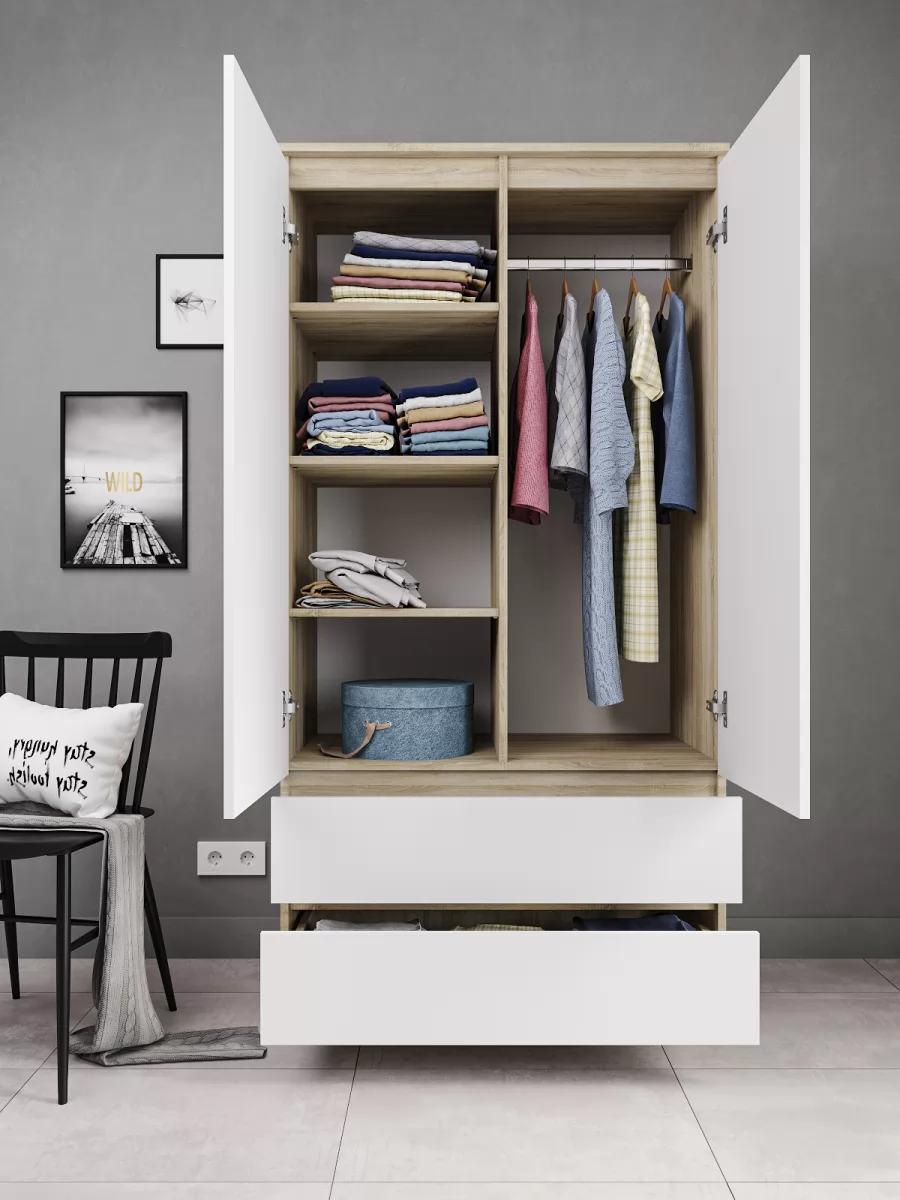 Функциональный шкаф с двумя дверями и двумя выдвижными ящиками. Отличается вместительностью и удобством эксплуатации.