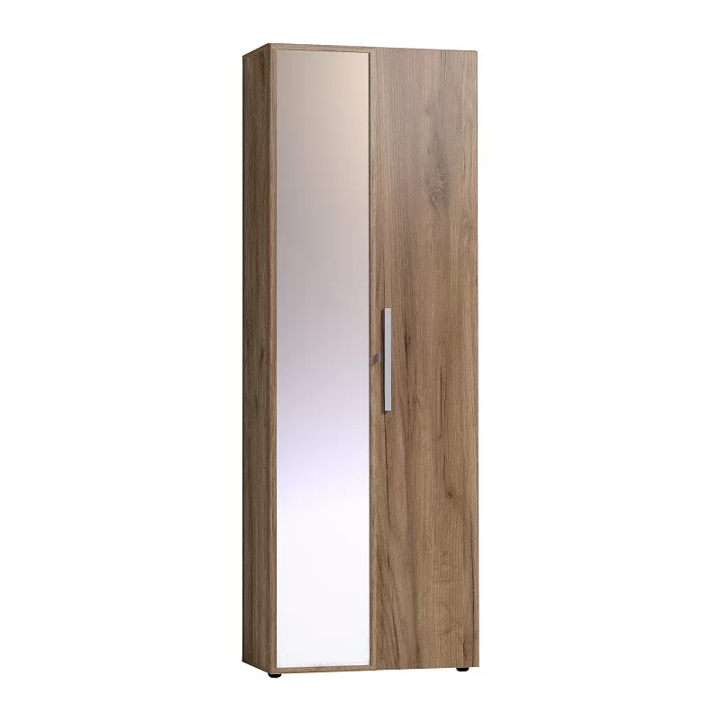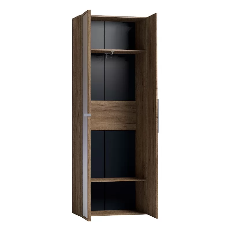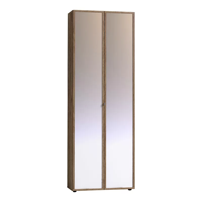 Двухдверный распашной шкаф с одним глухим фасадом и одним зеркальным фасадом в массивной раме Контур. Глухой фасад с ручкой из дерева, которая окрашена в серый цвет. Фасад Зеркало Контур открывается за ручку-петлю из высокопрочной микрофибры. Регулируемые опоры компенсируют незначительные неровности пола.
