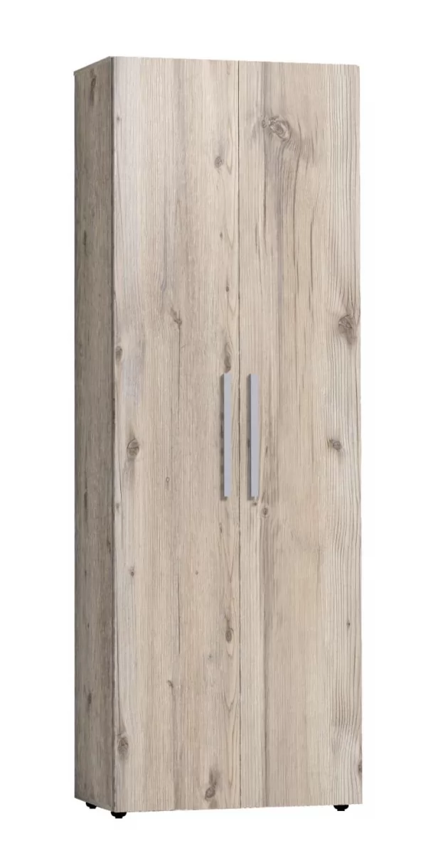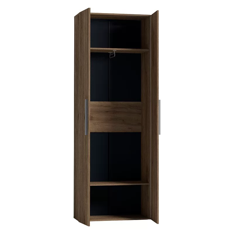 Двухдверный распашной шкаф с одним глухим фасадом и одним зеркальным фасадом в массивной раме Контур. Глухой фасад с ручкой из дерева, которая окрашена в серый цвет. Фасад Зеркало Контур открывается за ручку-петлю из высокопрочной микрофибры. Регулируемые опоры компенсируют незначительные неровности пола.