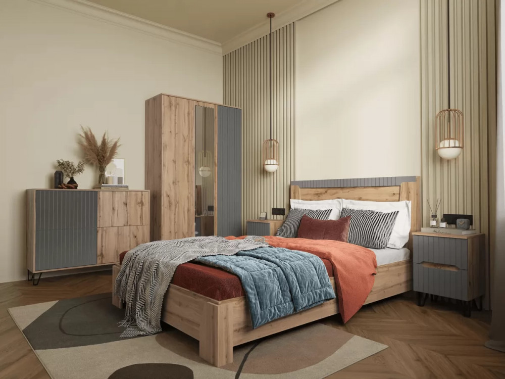Модульная спальня «Ливерпуль» выполнена в самых актуальных сочетаниях 2023 года: спокойные цвета корпуса с ярким акцентом в виде фасада из МДФ. Опора в стиле «Лофт» притягивает взгляд. Благодаря системе открывания «push to open» изделия выполнено без ручек. Также в данном стиле выполнена модульная гостиная.