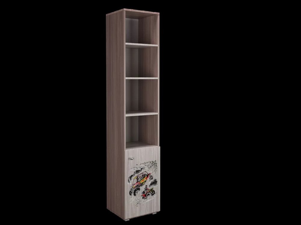 Шкаф-стеллаж 400 1Д имеет открытые полки и секцию с распашной дверцей, декорированной рисунком "Форсаж". Шкаф удобен для размещения книг, учебных принадлежностей или игрушек.