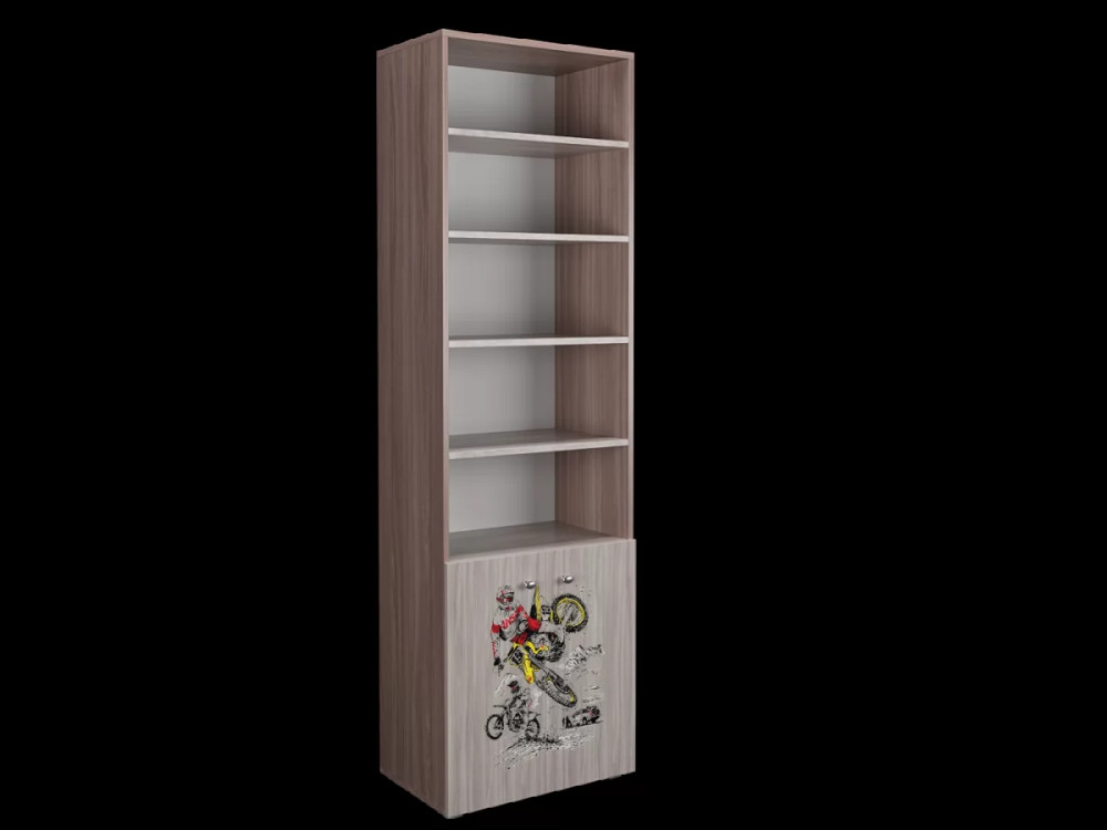 Шкаф-стеллаж 600 2Д имеет открытые полки и секцию с распашными дверцами, декорированными рисунком "Форсаж". Шкаф удобен для размещения книг, учебных принадлежностей или игрушек.