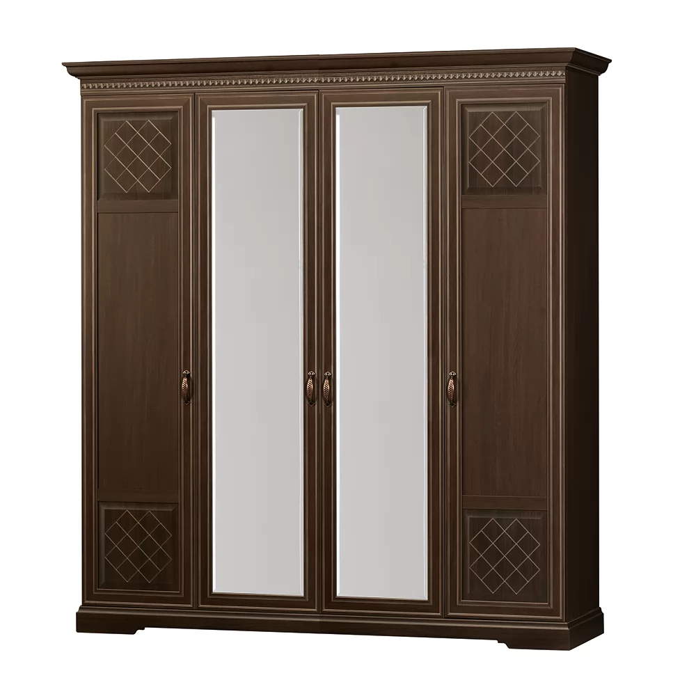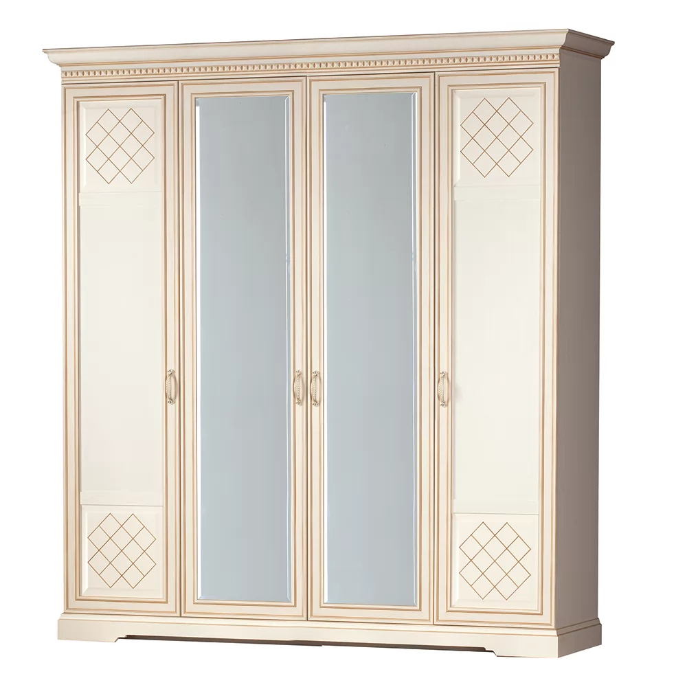 Классическая спальня «Парма» – выполнена в двух цветах: элегантном кремово-белом декоре с применением эффекта благородной патины и темном цвете, имитирующем натуральный цвет дуба со светлой патиной теплого оттенка. При разработке мебели использованы классические приемы: рамочные фасады с объемной вставкой и фрезерованным рисунком с нанесением патины, декоративные фрезерованные накладки и карнизы, ручки в светлом декоре белые с золотой патиной и шлифованные бронзовые в темном исполнении удачно подчеркивают рисунок на вставках фасадов. Фрезерованный и патинированный цоколь придает элегантность и завершенность системе. Крашеное изголовье кровати с нанесением патины и мягкой вставкой с утяжками создают богатый внешний вид и уют в спальне.