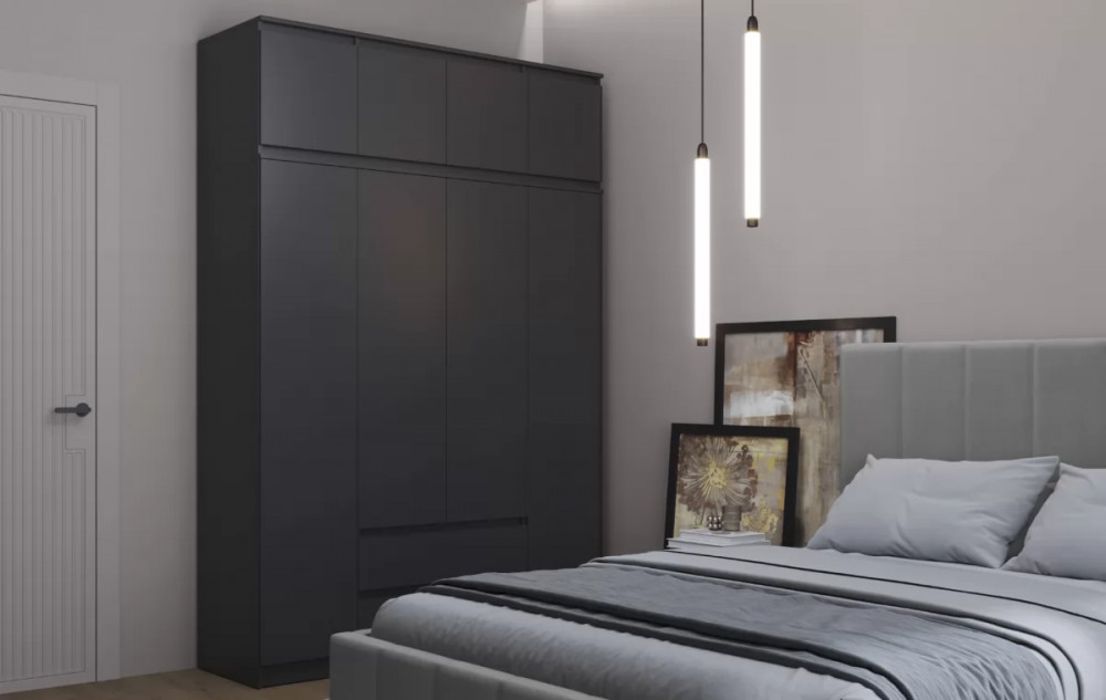 Особенность коллекции заключается в возможности трансформации пространства: тумба-антресоль легко устанавливается сверху основного шкафа, увеличивая высоту конструкции и повышая её функциональность.