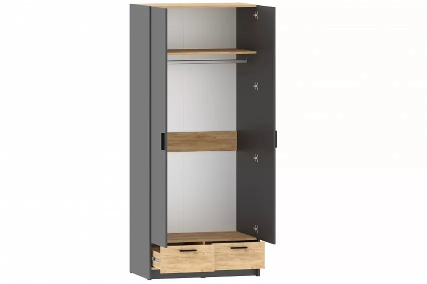 Шкаф оснащен двумя выдвижными ящиками для вещей, которые плавно и бесшумно скользят за счет шариковых направляющих, а также овальной штангой для хранения одежды на вешалках. Шкаф можно дополнить другими модульными шкафами из одноименной коллекции.