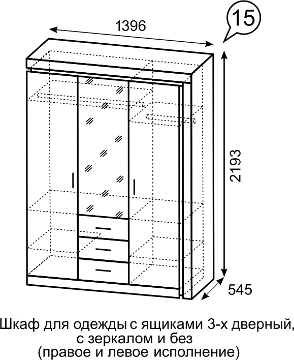 Шкаф для одежды с ящиками 3-х дверный с зеркалом Люмен №15