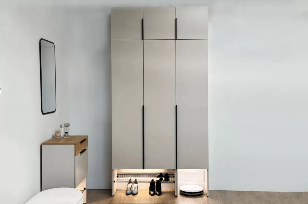 Шкаф оснащен накладными петлями с доводчиком от Боярд, которые обеспечивают плавное и бесшумное закрывание дверей. Выдвижная штанга и отделение с полками предоставляют удобный доступ к одежде, позволяя легко организовать внутреннее пространство.