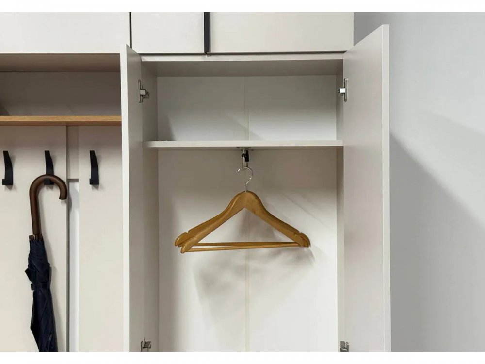 Шкаф оснащен накладными петлями с доводчиком от Боярд, которые обеспечивают плавное и бесшумное закрывание дверей. Выдвижная штанга предоставляет удобный доступ к одежде, позволяя легко организовать внутреннее пространство.